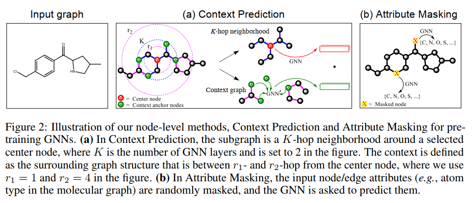 在节点级上,预训练时分别考虑图的结构特征以及属性特征。在结构特征方面,文中将常见的“节点-邻居”模型扩展为“节点邻居子图+上下文子图”,用节点邻居子图与上下文子图的相似性衡量结构相似性,分别用图神经网络学习两个子图的特征。节点邻居子图和上下文子图之间的锚节点(“context anchor nodes”)体现了节点邻居子图和上下文子图之间的信息关联。在属性特征方面,利用”MASK-PREDICT”的方法,通过分别mask节点和边的属性来学习图的属性特征,这种方法可以是的帮助模型对 domain knowledge 的学习。