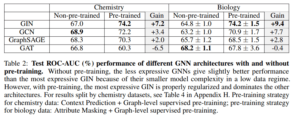 作者在论文公布的数据集上用常见的图神经网络模型进行了实验。可以看出,pre-training 使得 GIN、GCN 和 GraphSAGE 的模型表现均取得了提升,GAT 的表现显著下降。作者认为,GIN 的表达力更强,在多数据和领域的 pre-training 上能够取得更好的提升。本文首次提出了大规模图神经网络预训练模型,对未来的相关研究具有参考意义。