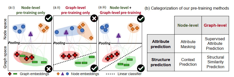 预训练是通过大量无标注的数据进行模型的训练,得到一套模型参数,利用这套参数对模型进行初始化,再根据具体任务在现有语言模型的基础上进行精调(MSRA)。预训练的方法在自然语言处理与计算机视觉领域,都被证明拥有更好的效果。不过,在图的表示学习领域,预训练仍然是一个具有挑战性的问题。本文提出了一个在多图分类任务上的图神经网络预训练模型,希望得到节点级别和图级别的高质量预训练参数,可以鲁棒的迁移到下游任务。