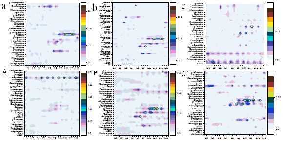图2. 12C (a, P0; b, P50; c, P200) 和13C (a, P0; b, P50; c, P200) DNA-SIP分层样品细菌16s高通量分析