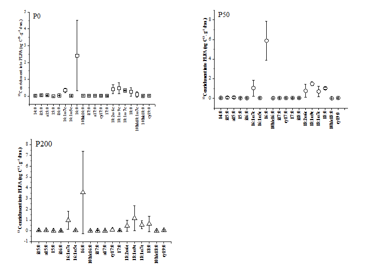 图1. 13C 在细菌磷脂脂肪酸的富集。P0: 100 mg N kg-1, 100 mg K2O kg-1 and 0 mg P2O5 kg-1; P50: 100 mg N kg-1, 100 mg K2O kg-1 和50 mg P2O5 kg-1; P200: 100 mg N kg-1, 100 mg K2O kg-1 和200 mg P2O5 kg-1