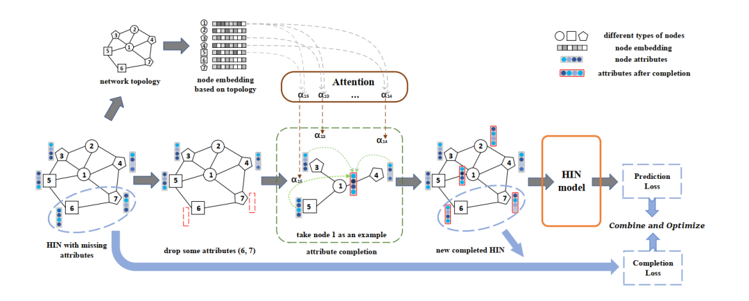 本文发现,面对异质网络中复杂的属性缺失情况,与专注于设计新模型的传统研究方向相比,属性补全变得尤为重要,并且可以成为一个全新的、更有效的提升性能的方向。本文首次科学地对异质网络中的缺失属性进行了补全,并提出了通用的框架来解决异质图神经网络模型中面对的属性缺失问题。具体地,在该框架中,首先基于面向元路径的高阶拓扑信息来挖掘节点间关系,并将其作为节点之间语义关系的先验知识。接着为节点属性的补全提供了一种具有先验信息指导的、有效的注意力机制,并通过随机删除属性来实现弱监督损失的定义,从而使属性补全成为在先验知识指导下合理的可学习过程。最终在同一图神经网络框架下定义了属性补全过程和目标任务,以构建任务导向的端到端框架,实现两者的相互增强。该框架可与多数异质图神经网络模型正交,为这些模型带来稳定的性能提升。本文也希望这种新观点能够为现有的基于图神经网络的异质网络研究提供一个新的、有效的方向。