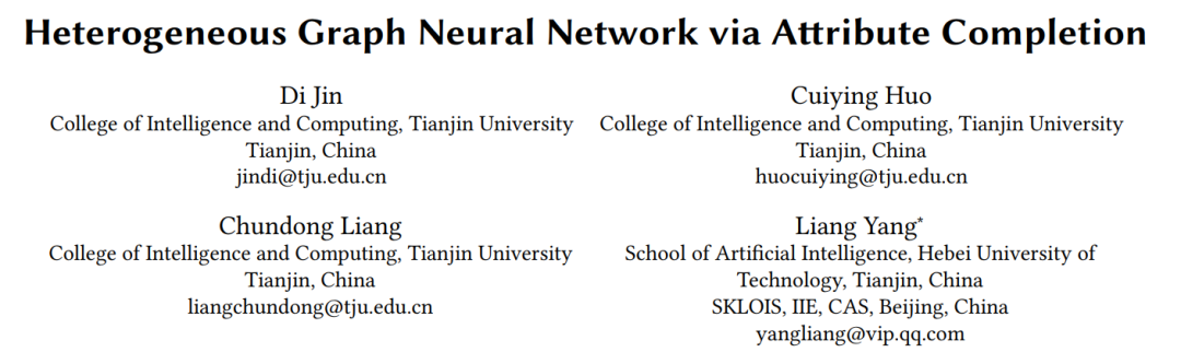 WWW-2021最佳论文奖(亚军)来自天津大学金弟副教授团队。该研究原创性的提出了异构信息网络属性补全问题及其高效求解方案。该方案正交于已有异构图神经网络框架,并在多个真实世界的异质数据集上取得了优秀的结果。