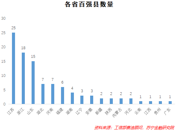 在100个中国县域经济的代表中,江苏、浙江、山东这三个省份可以用“霸榜”来形容,三个省份的百强县数量分别为25、18、15个,占据百强县多数席位,而多数中西部、东北地区的省份无缘县域百强。
