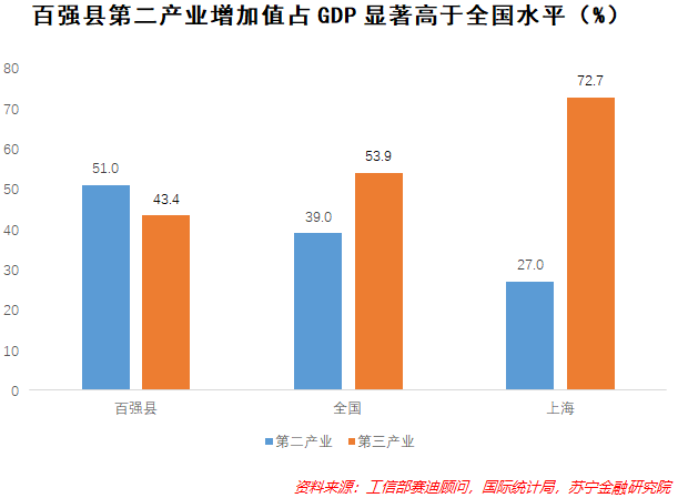 从百强县的发展情况看,绝大多数百强县的发展依然依靠工业和投资,根据赛迪顾问的数据,百强县规上工业增加值和第二产业增加值及增速都远超广东、江苏、山东和浙江等发达省份。