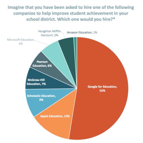 调查结果显示 52% 的教育工作者选择了 Google,Apple Education 以 13% 位居第二,而微软只有 6%。