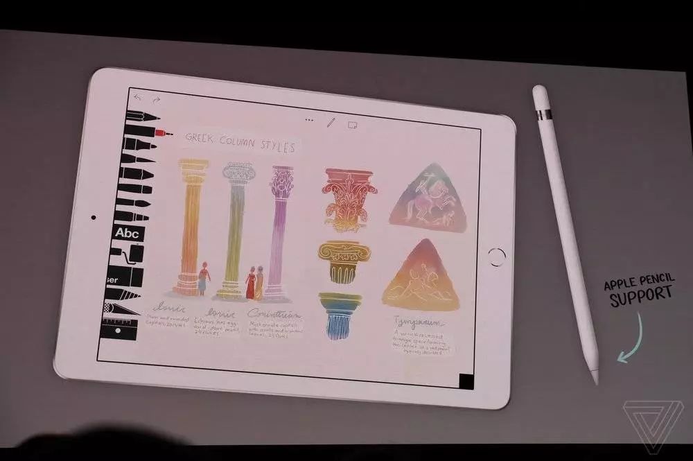 尺寸(和边框)看起来与当前的iPad完全相同。支持Apple Pencil,重量约453克,内置A10处理器,续航时间达 10 小时,支持 Touch ID、Rkit,支持 300MBps LTE 网络。