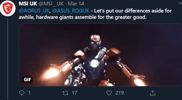 英特尔、微星等硬件厂商也纷纷响应,表示要「搁置分歧」,共同抗疫。其中,英特尔的画风是这样的: