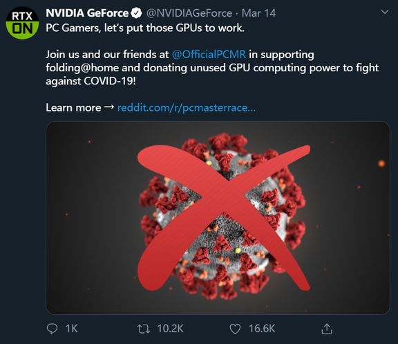 随着疫情在国外的蔓延,这一项目得到了全球多家硬件巨头和诸多 PC 玩家的支持。英伟达在官方推文中呼吁道,「PC 玩家们,一起启动 GPU 来抗击新冠肺炎吧!」