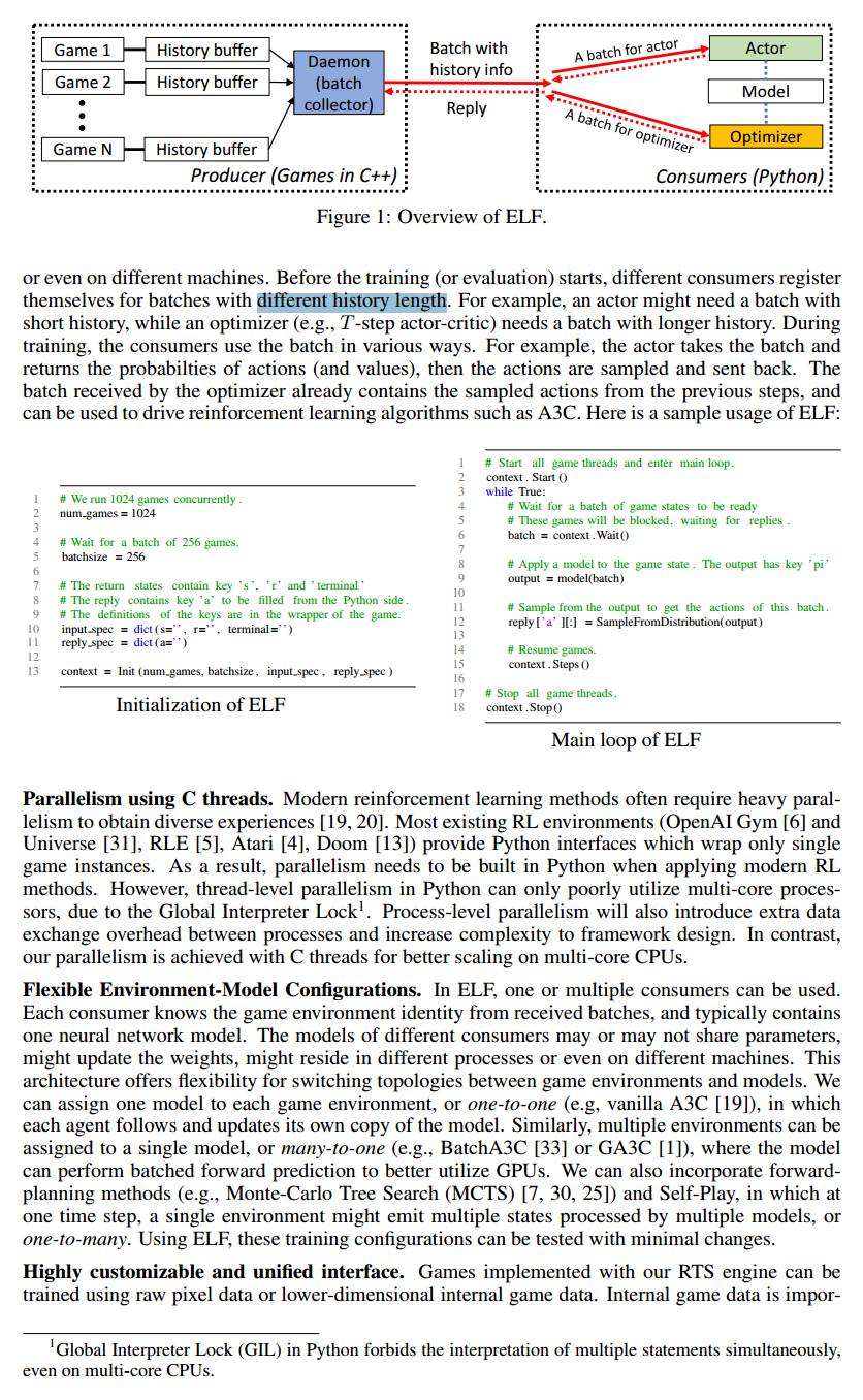 Lightweight: ELF runs very fast with minimal overhead. ELF with a simple game (MiniRTS) built on RTS engine runs 40K frame per second per core on a MacBook Pro. Training a model from scratch to play MiniRTS takes a day on 6 CPU + 1 GPU.