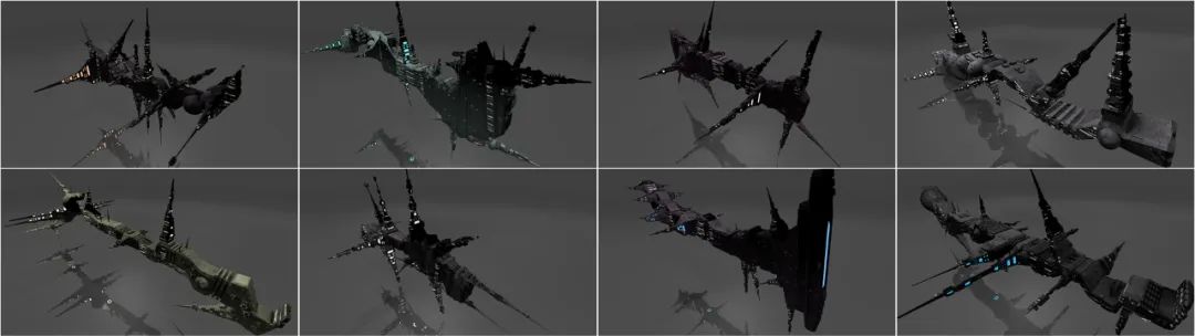 首先从一个盒子开始延伸建造船体,多次拉伸前、后表面,并在此过程中随机添加平移、缩放、旋转效果;其次开始在船体上增加不对称性,选取随机的面并将其以类似的方式改变;然后向船体添加细节,按其朝向对每个面孔进行分类,并在其上生成一些细节,例如引擎、天线、炮塔、照明灯等;最后进行一些细微调整等,如下图: