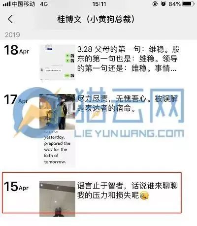 小编注意到,小黄狗总裁桂博文在4月15日发朋友圈称:“谣言止于智者,话说谁来聊聊我的压力和损失”。疑似回应此次小黄狗资金冻结、欠薪事件。