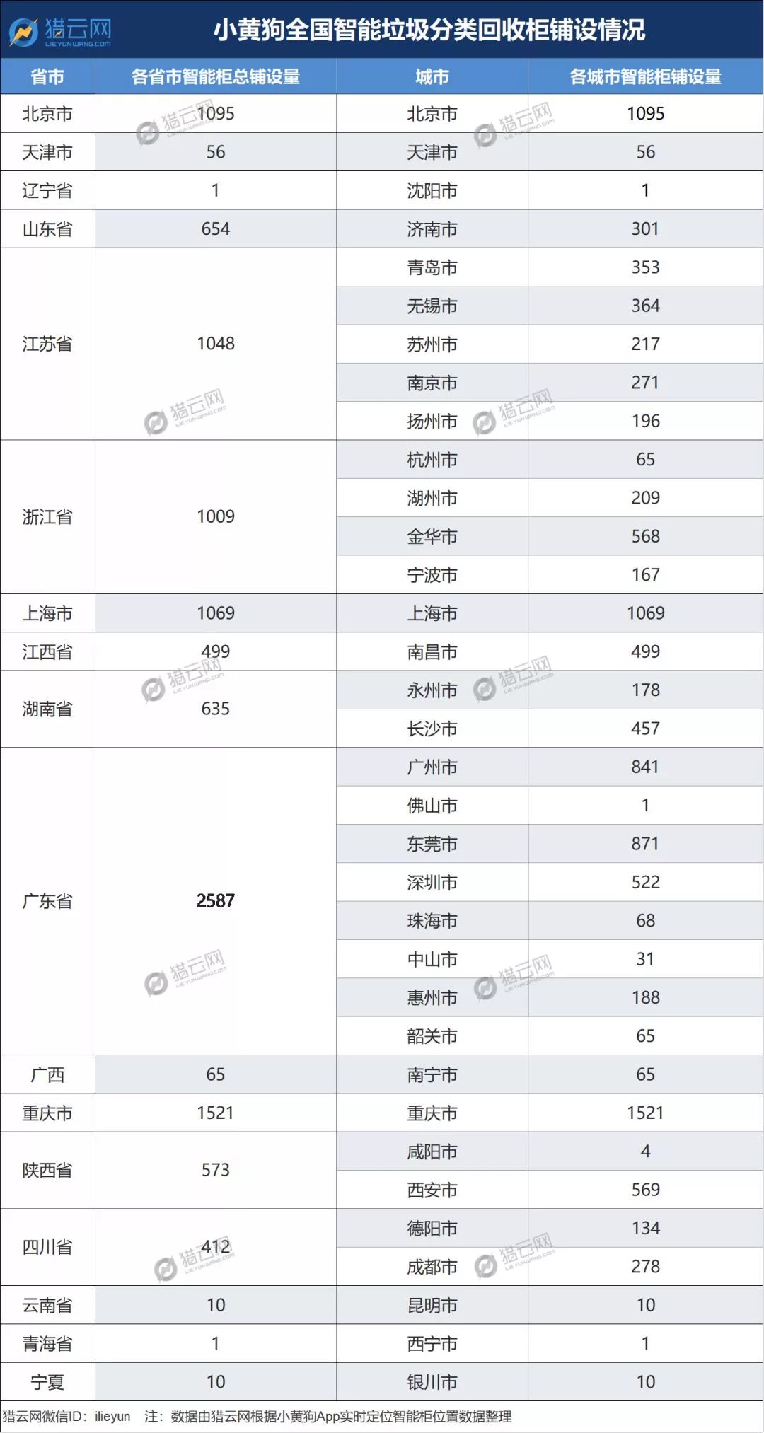 小黄狗于2019年1月底宣布铺设智能柜突破10000组。据猎云网统计,根据小黄狗App上实时定位到的智能柜数据显示,小黄狗已入驻17个省市共34个城市,总铺设11245台。其中广东省、江苏省、浙江省、北京市、上海市和重庆市均已铺设上千台,并以广东省2587台为铺设最多的省份,光东莞就铺设了871台智能柜。