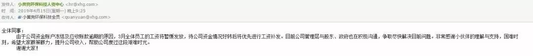 小黄狗在内部邮件中解释称,“受‘团货网’事件的影响,导致公司账户被政府冻结,公司缺少流动资金,无法正常运营,也无法按时发放工资、缴纳社保和住房公积金,后续业务发展方向尚不明朗。”对于员工薪资发放安排,发放日期不确定。