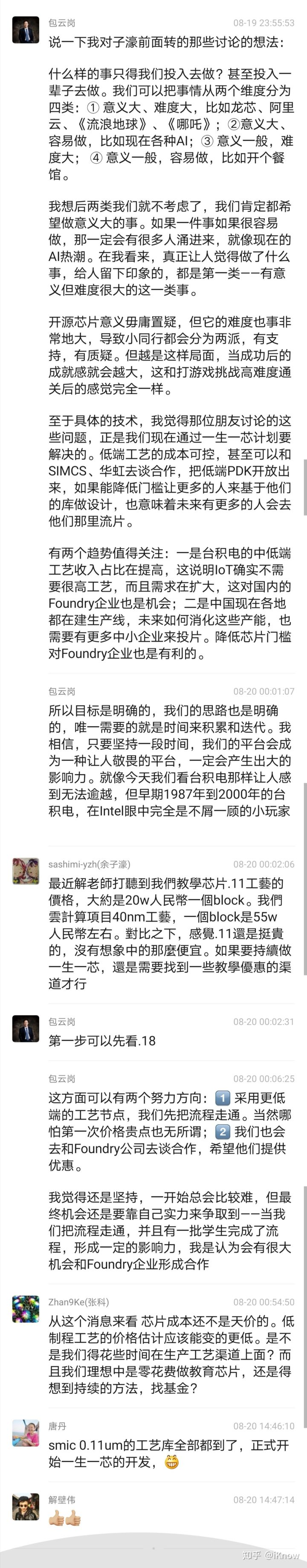 我们在调研中发现和“一生一芯”计划目标最接近的是2017年春季开始UC Berkeley开了一门新课 EE194/290C “28nm SoC for IoT”,目标是设计一个SoC芯片,集成各种IP模块,包括一个Berkeley开发的RISC-V Rocket处理器核。这门课以流片为目标,2017年春由9位本科生与1位研究生参加,通过1学期完成了流片,但未提供信息证明芯片能正常工作。伯克利EE194/290C这门课是根据已有的RISC-V核和其他IP核进行SoC集成。而“一生一芯”与EE194/290C课程的区别在于要让本科生直接设计一款64位RISC-V处理器,然后在这个核的基础上,学生们需进一步集成与验证一系列外围IP,最终形成一个能运行Linux操作系统的SoC芯片,这极具挑战。一年前,我们不知道这个目标是不是可行,最终能不能成功。但如今,我们探了回路,并且把路走通了,证明是可行的。这个摸索的过程积累了不少经验,也充满了教训。五位同学作为小白鼠参与首期“一生一芯”计划,成长了很多。他们不仅在项目中掌握了处理器芯片设计所需的专业知识,也锻炼出了优秀人才所具备的出色心理素质。一起来看看他们的感悟:如今,这五位同学正在参与一个更有挑战的项目,开发一款高性能乱序多发射RISC-V处理器核的设计。一年前,他们在做“果壳”时还有些吃力,现在已是这个新团队中的骨干,和其他博士生和工程师们一起攻坚克难。去掉团队中蔡晔、唐丹和我这三位40岁以上的中年人,这支队伍平均年龄只有23.1岁,但他们表现出来的战斗力却是惊人的——不到三个星期就从头开始完成了乱序处理器主流水线的设计与实现,并且通过CoreMark测试。等到他们30岁时,就可以说已经是处理器芯片和计算机系统设计领域的“老兵”了。那时,他们将进入各自的工作岗位,也许去工业界研发产品,也许在学术界做科研。相信那时他们的创造力会得到更大的发挥和展现。我对这批年轻人的未来充满期待。从教学团队角度来看,除了前期在总体方案、环境平台等方面需做好充分准备以外,在开发过程中有四方面指导尤其重要(以下为余子濠老师总结):