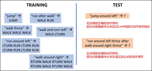 纽约大学教授 Brenden Lake 和 Facebook AI 科学家 Marco Baroni 的一系列研究表明,现有的深度学习模型并不具有组合泛化能力[4]。图4简单展示了他们的研究方法。实验任务是将诸如“run after walk”这样的自然语言句子翻译成诸如“WALK RUN”这样的指令序列(程序)。