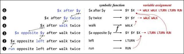 图6的左侧自下而上地给出了对于作为输入的自然语言句子的抽象化过程。在第1、2、4步,分别剥离掉“run”、“left”和“walk”这三个单词的具体属性,将它们抽象为变量;在第3、5、6步,分别剥离掉“$x opposite $y”、“$y twice”和“$x after $y”这三个子句属性,也将它们抽象为变量。人类记住的并非输入与输出之间的直接映射,而是这一抽象化过程中每一步所产生的局部映射(如图6右侧所示)的集合。