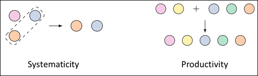 生产性则可以简单理解为通过一些潜在的普适规律,用相对简单的表达式构造出更复杂的表达式。比方说,一个人已经理解了“鸭嘴兽”和“狗在客厅里”,那么他一定能够理解“鸭嘴兽和狗在客厅里”。