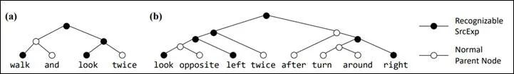 图9展示了 LANE 中的 Composer (TreeLSTM)学习得到的两个隐式树结构作为示例。TreeLSTM 在具体实现时是二叉化的,将具体进行抽象动作的结点着黑色。可以看到,即使并未引入任意人工预定义的抽象/映射规则,LANE 也能够自动化地探索出符合人类思维的抽象化过程。