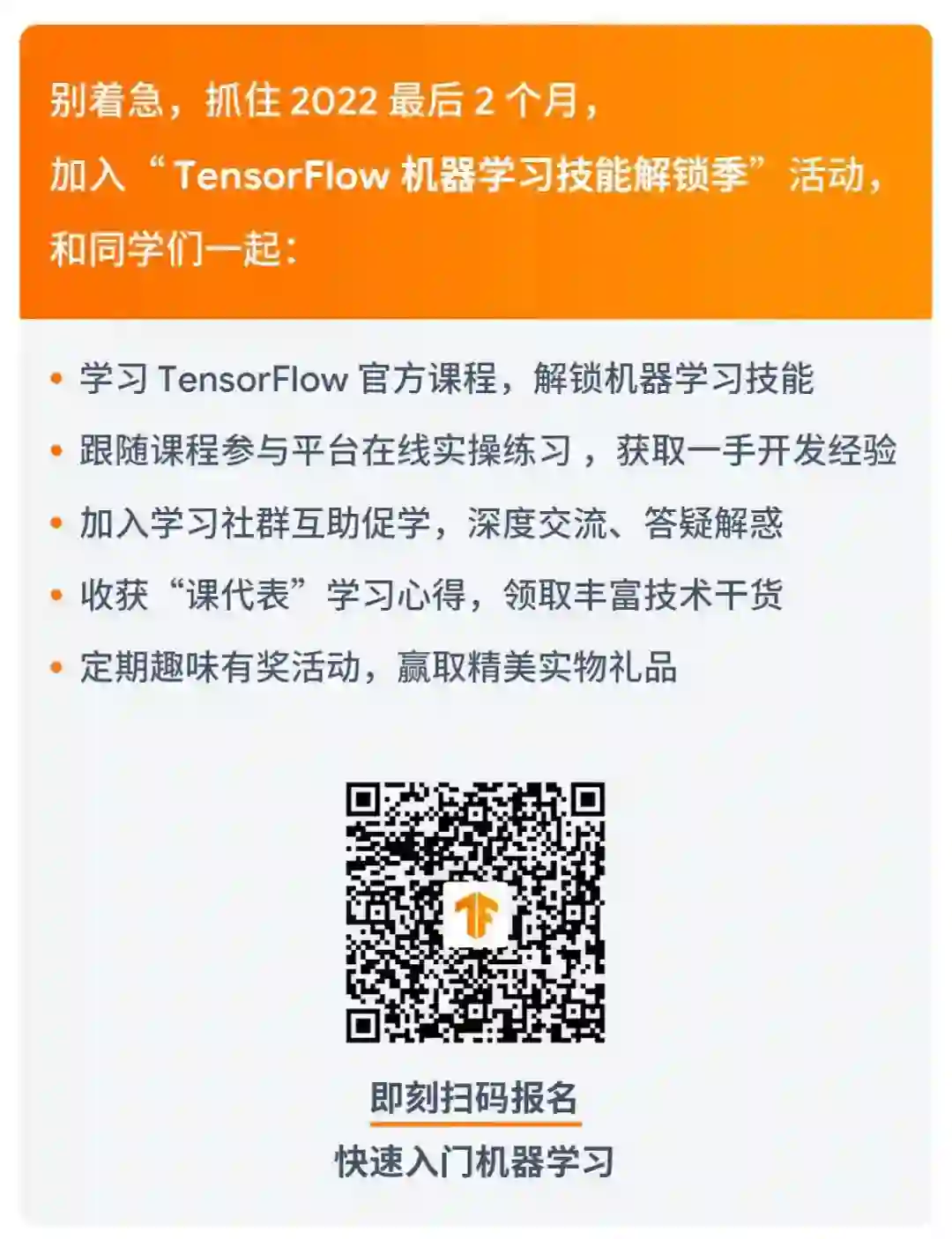 想进一步提升机器学习能力,挑战自己?欢迎报名参与 TensorFlow 开发者认证计划,掌握更多机器学习技能,强化你的核心竞争力。