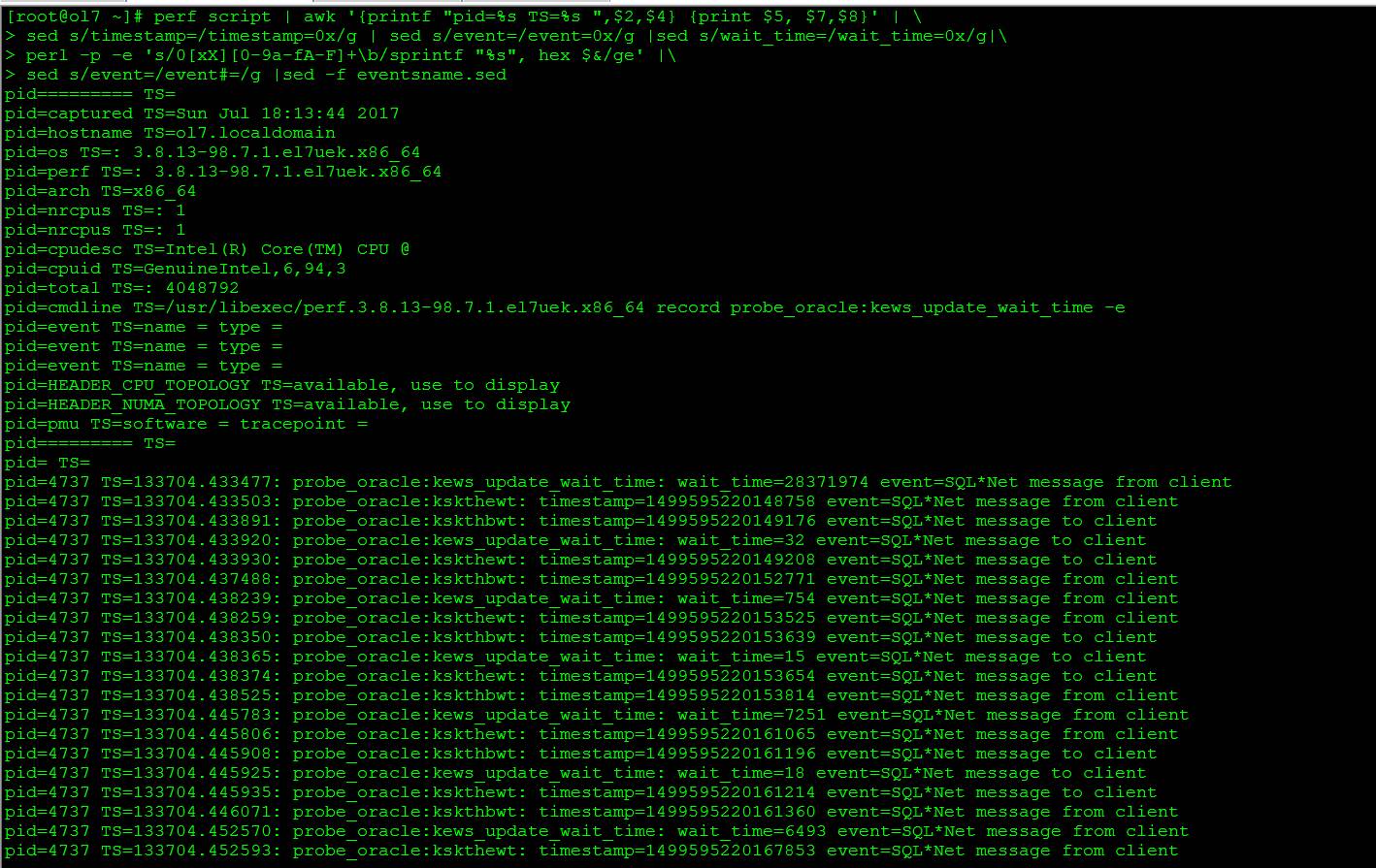 上图我们能够看到探针做的一些事情。会话2794等待事件0x162,等待时间ox553df61f78f21,然后下一个等待事件0x93,等待时间0x553df61f7938d。这些数据不是很直观,我们需要对其格式化一下。等待事件的这些编号需要从视图v$event_name获取。