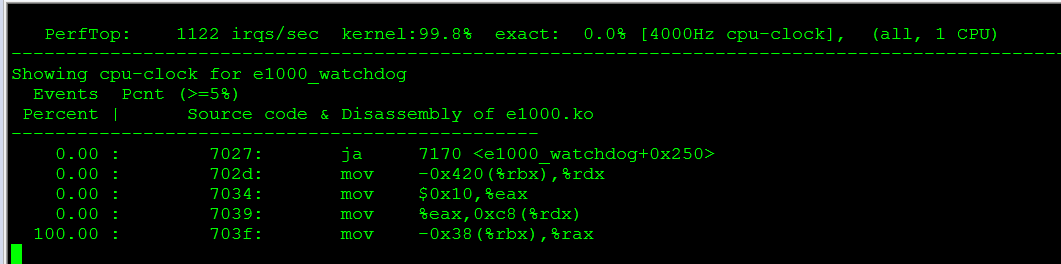 当然,如果想要继续分析下去,还可以按s,再输入函数名,如图所示,我输入了函数e1000_watchdog,显示下面具体的code地址及原子操作。这里的ja和mov都是汇编语言的一些操作,ja是判断两个无符号数之间的大小关系然后跳转,mov是数据传送指令。
