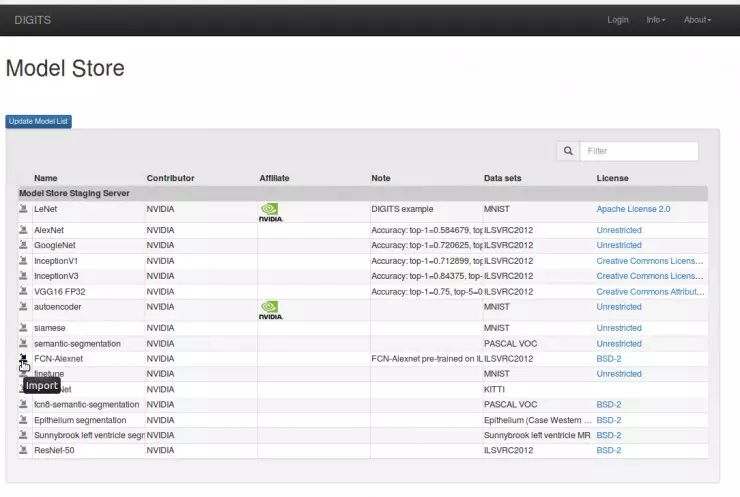 在DIGITS里训练模型,有数据集和对神经网络的描述就够了。如果你觉得用卷积Alexnet太复杂太耗时的话,别烦恼:DIGITS 5.0版有一个模型商店,而且就像你能想象的那样,FCN-Alexnet可以从这个模型商店里下载!