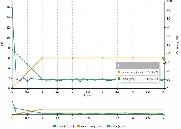 但如果你决定要走一条更难的路,去创造自己的模型描述,就可能要找一个合适的权重初始值方案,比如说Kaiming方法(另名MSRA),是目前最前沿的修正流线性单元形式。这个在Caffe里很容易实现,只要加上一个权重过滤器 { type: "msra" }指向你的参数层就好了。如果在DIGITS里用这种方法训练模型,很有可能得到像图11的曲线。从图中可以看出,结果并不尽如人意。验证集的准确程度在35%的时候达到最高(意思是说只有在验证数据集里35%的像素被准确地标记出来)。训练损失跟验证损失一致,意味着这个网络(模型)对训练数据集欠拟合。