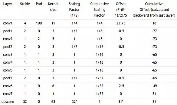 表2:卷积化的Alexnet中,遍布连续层的缩放因子和抵消补偿。* 对反卷积层来说缩放因子等于步幅,抵消等于(k - 1)/ 2 p。