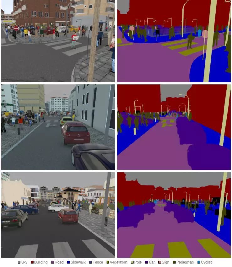 SYNTHIA数据集的样本图像见图9。这些图像展示了用不同的对象类合成的城市场景,比如不同条件下的建筑物、道路、车辆和行人, 如昼夜。有趣的是,图片看起来特真实以致于有时候人们会被它们吸引:嗯,第一张图片上那个在路中间看报纸的人有点反常,这么干很危险。