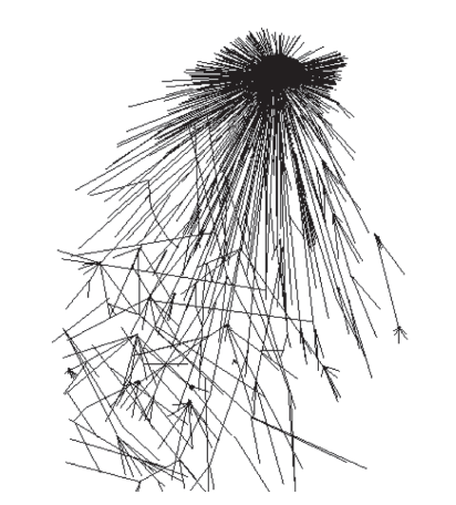 一旦我们有了一个全面的数据库,其中包含自推特问世以来的10年间各种经过事实核查的谣言,我们就可以搜索有哪些推文曾经提到过这些谣言,然后通过反向追踪这些谣言的转发链条,找出“原始”的推文(即第一篇在推特上提到这些谣言的推文),这样我们就可以重建这些谣言在网上通过转发进行传播的整个过程(实际上,这个过程是众多拥有单一共同源头的完整转发链条所组成的集合)。在我们把完整的转发链条图形化以后,整个转发的过程呈现出了一种奇异的、让人感到非常陌生的形态。一般来讲,这个过程的图形会从原始的推文开始,呈放射状向四周发散,通过转发扩散开来,接着,每一个方向上都会形成新的转发链条,而这些链条看上去就好像是从中心向外延伸的水母的触须。我们在下图中画出了这些虚假新闻众多转发链条中的一条(见下图),用数学的方式描绘了这些虚假新闻随着时间的推移在推特的用户群中不断被转发并传播的过程,进而分析了虚假新闻的传播是如何变得与真实新闻的传播不同的。