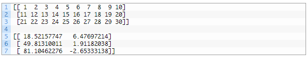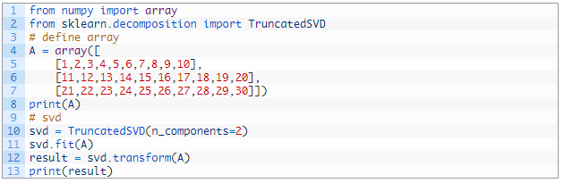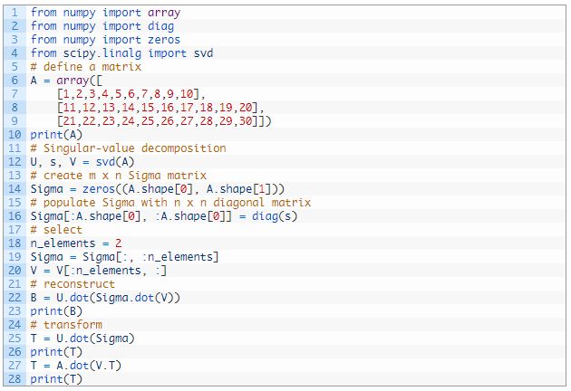 首先定义一个 3×10 的矩阵,其列数多于行数。然后计算 SVD 并且只选取其前两个特征。这些元素再重新结合起来,得到原始矩阵的准确再现。最后计算转换的方式有两种。