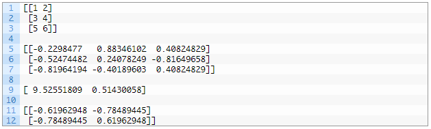 运行这个示例,首先会显示定义的 3×2 矩阵,然后会显示分解计算得到的 3×3 的 U 矩阵、2 个元素的 Sigma 向量和 2×3 的 V^T 矩阵元素。