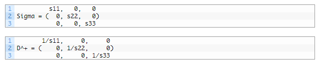 根据 Sigma 创建一个对角矩阵,计算 Sigma 中每个非零元素的倒数,然后如果原始矩阵是矩形的就取其转置,就可以计算得到 D^+。