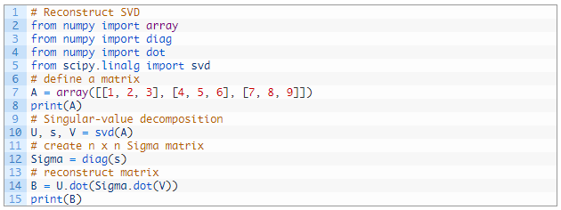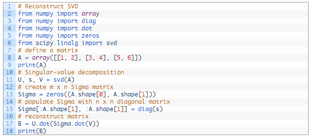 运行这个示例会显示原来的 3×3 矩阵和根据 SVD 元素直接重建的版本。