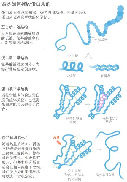 生命所必需的蛋白质通常具有十分精准的形态,它们以长链的形态开始,根据其分子序列,折叠成螺旋状、片状、或其他形状,这些形状在保证蛋白质的功能上发挥了巨大的作用。然而,当温度开始升高时,维持蛋白质结构的化学键会遭到破坏:先从较弱的开始,随着温度的升高,更强的化学键也不能幸免。这也解释了细胞为何缺乏耐热性。我们知道蛋白质结构的大面积损伤是致命的,但直到最近,我们才搞清楚过高的温度是否、以及如何杀死细胞的。
