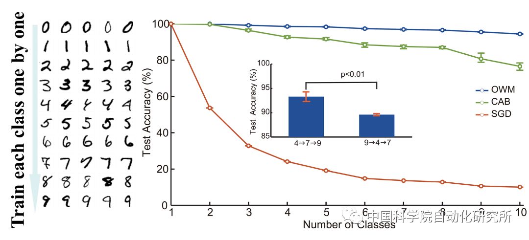 图 2:在连续学习 MNIST 手写体数字 0-9 的任务中,随着任务数目的增加,OWM 算法的优势也愈加明显。同时,任务的学习顺序会对个别任务产生影响。如先学数字 4 和 7,会显著提升数字 9 的识别正确率。