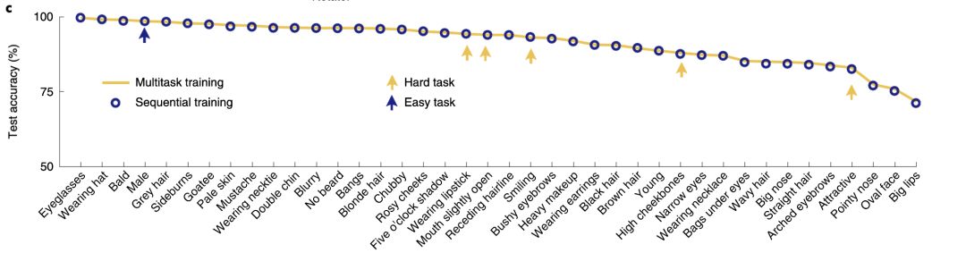 同一个分类器对于同样的输入,连续学习 40 种不同人脸属性的分类任务 (蓝色数据点),正确率与用 40 个分类器的系统 (橙色线) 几乎一致