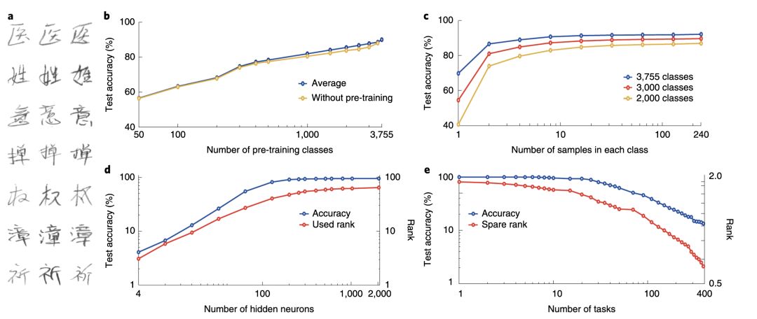 利用 OWM 算法,神经网络可以连续学习识别 ImageNet 的 1000 类图片和 3755 个中文手写体汉字 (每个任务仅训练一类图片或一个汉字)。值得一提的是,算法具有优良的小样本学习能力,以手写体汉字识别为例,基于预训练的特征提取器,系统可以从仅仅数个正样本中就能连续的学习新的汉字。