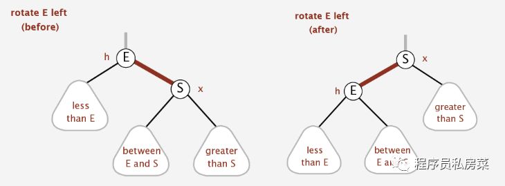 通常左旋操作用于将一个向右倾斜的红色链接旋转为向左链接。示意图如下: