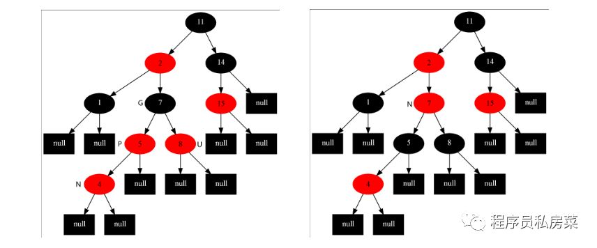 对于情况2:插入节点的父节点是红色,叔叔节点是黑色,且插入节点是其父节点的右子节点。我们要做的操作有:将当前节点(7)的父节点(2)作为新的节点,以新的当前节点为支点做左旋操作。完成后如左下图所示,这样左下图就变成情况3了。