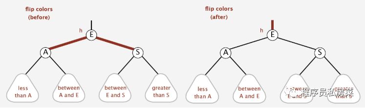 改变节点颜色比较容易理解,因为它违背了规则3。假设现在有个节点E,然后插入节点A和节点S,节点A在左子节点,S在右子节点,目前是平衡的。如果此时再插一个节点,那么就出现了不平衡了,因为红色节点的子节点必须为黑色,但是新插的节点是红色的。所以这时候就必须改变节点颜色了。所以我们将根的两个子节点从红色变为黑色(至于为什么都要变,下面插入的时候会详细介绍),将父节点会从黑色变成红色。可以用如下示意图表示一下: