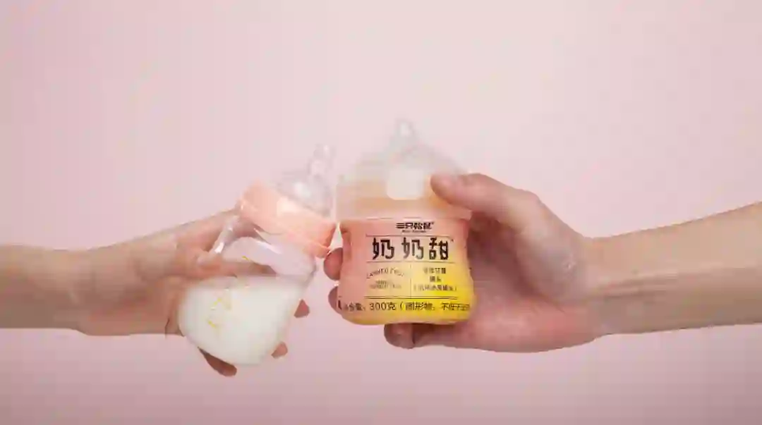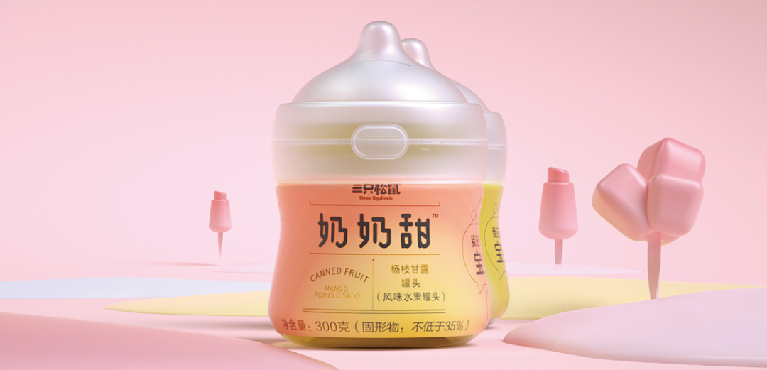 三只松鼠这款“奶奶甜”水果罐头,主打童趣定位,将瓶盖设计成了奶嘴。一瓶拿在手中,满满童心放佛要从奶嘴中溢出来了。