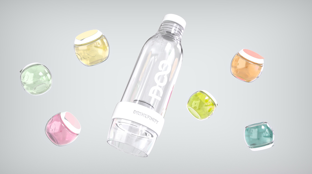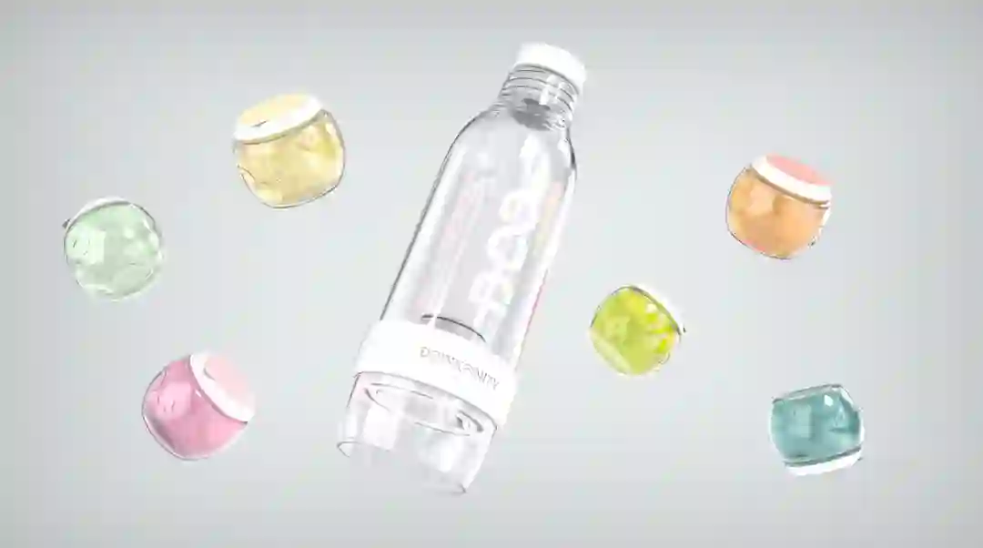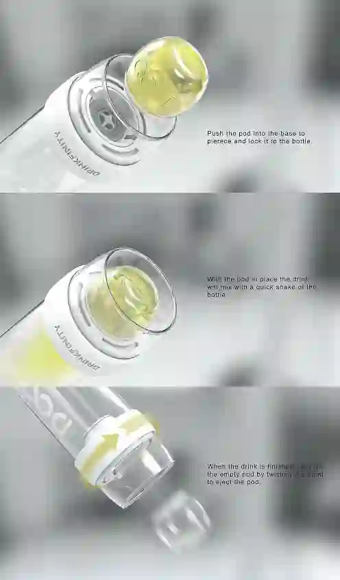 2018年,百事曾推出一款“Drinkfinity”便携饮料,“豆荚”中含有浓缩果汁、固体粉末等物质,将瓶中灌满饮用水,“豆荚”放在瓶口,释放,便是一整杯果汁。