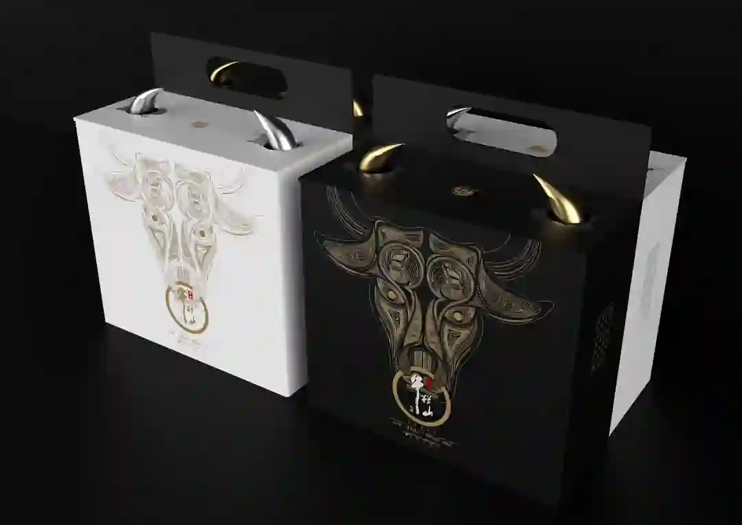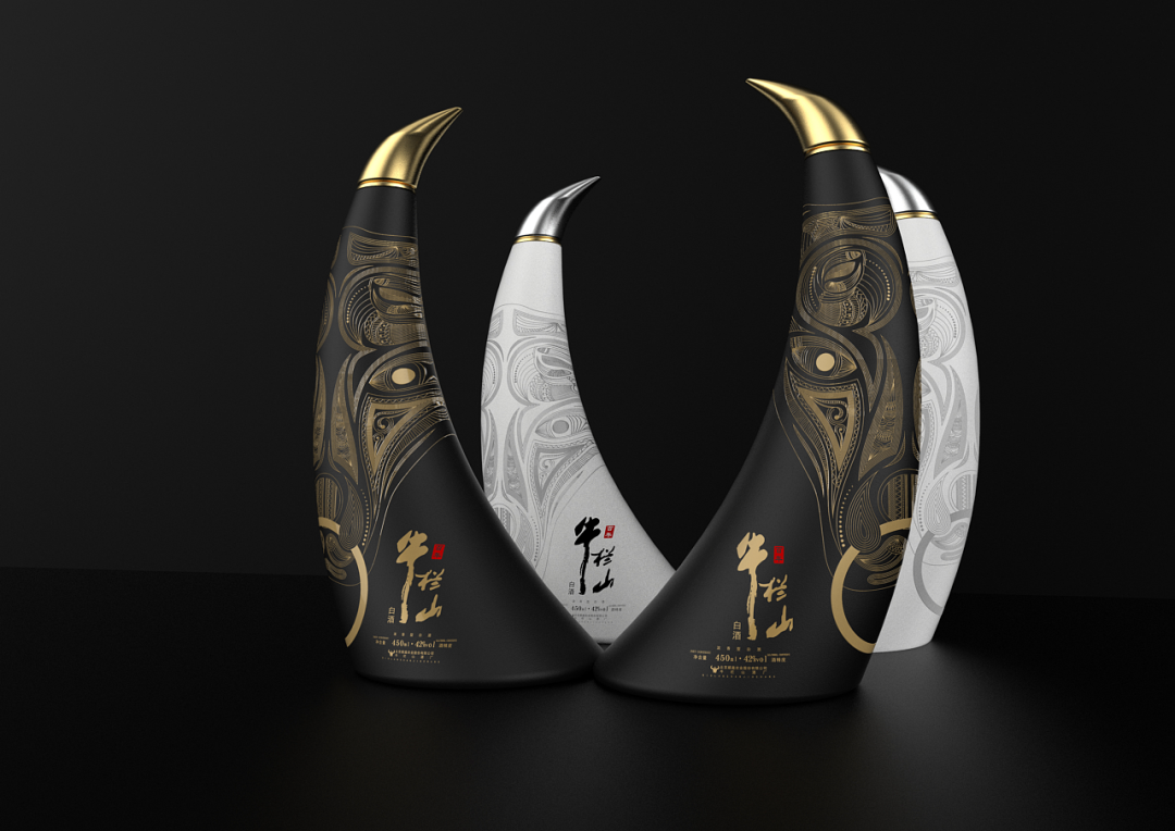 这款牛栏山牛角瓶,瓶盖迎合瓶身整体设计成牛角形状。装在盒中,两个牛角还会从盒顶伸出,与外包装盒设计形成一只大牛头,与品牌名相贴合,真是“牛气冲天”。