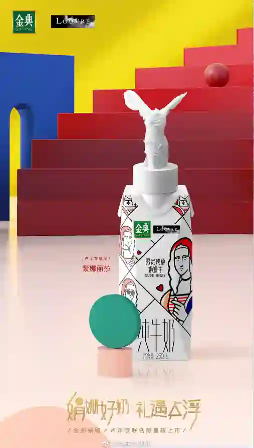 金典有机奶曾联名卢浮宫,推出一套“金典×卢浮宫联名限量版”,将断臂维纳斯、胜利女神像等卢浮宫“镇馆之宝”做成瓶盖,喝奶的同时也能获得艺术熏陶。