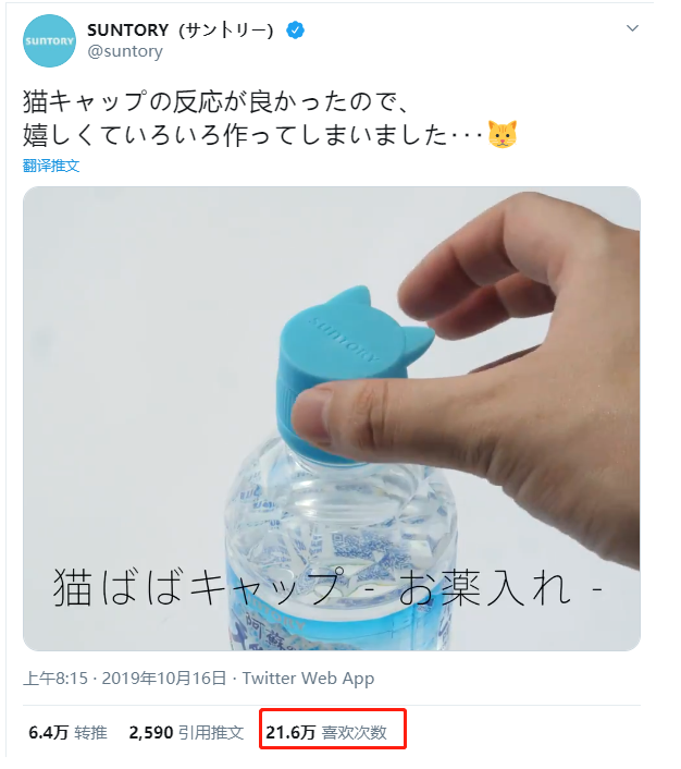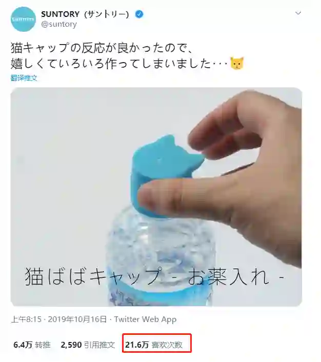 当年10月,三得利又一次性推出8款升级版“猫咪瓶盖”,让瓶盖兼具药盒、存钱罐、按摩器等多种功能。引起了网友们的热烈讨论,三得利官方推特中,当条推文点赞数达到21.6万,而三得利日常推文的点赞数只在400左右。可以说,这一次“瓶盖创意”,让三得利品牌的关注度暴涨500倍!