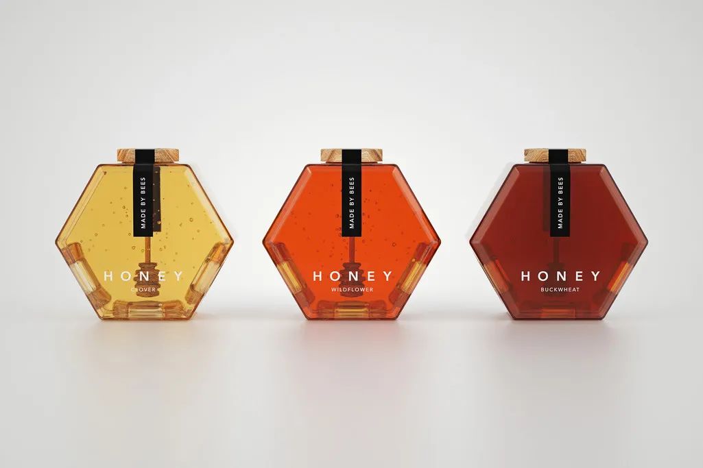 最后再来欣赏一个笔者非常喜欢的蜂蜜概念产品,瓶盖与瓶底的凹槽可以形成榫卯结构,多瓶蜂蜜拼在一起,可以组合成一个完整的“蜂巢”。