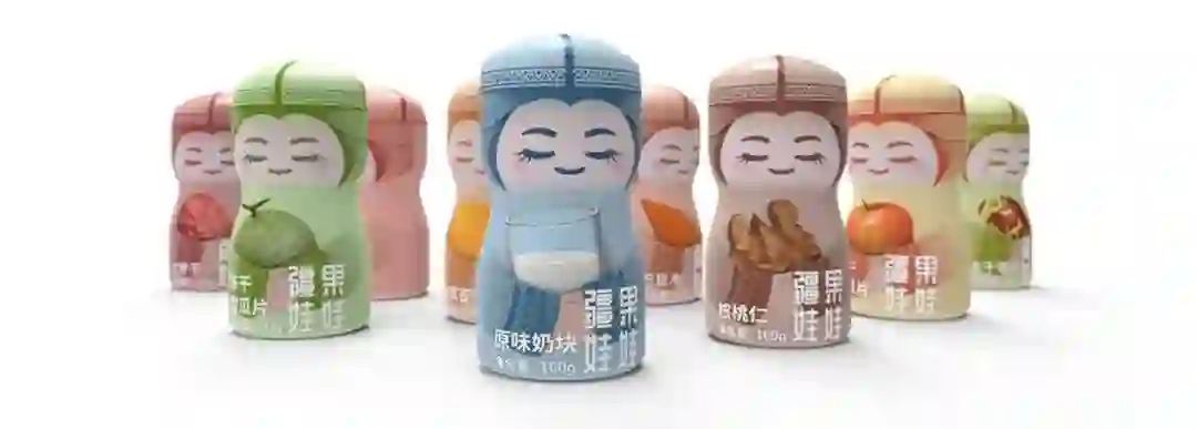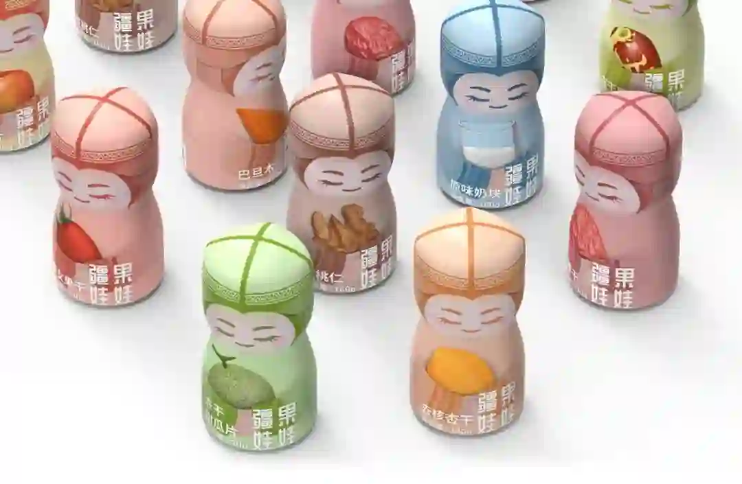 同样是将瓶盖作为人物头上的帽子,这款新疆特产“疆果娃娃”果干,采用了极具新疆民族特色的瓶子设计。这款设计也夺得了