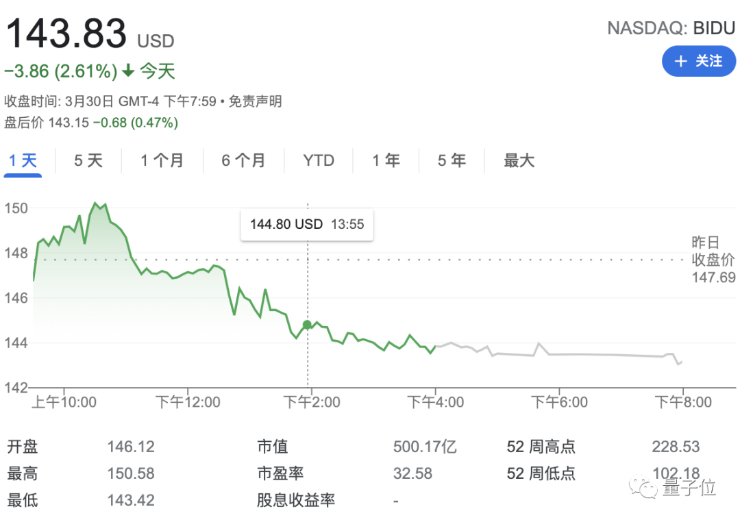 截止收盘,百度股价下跌2.61%。